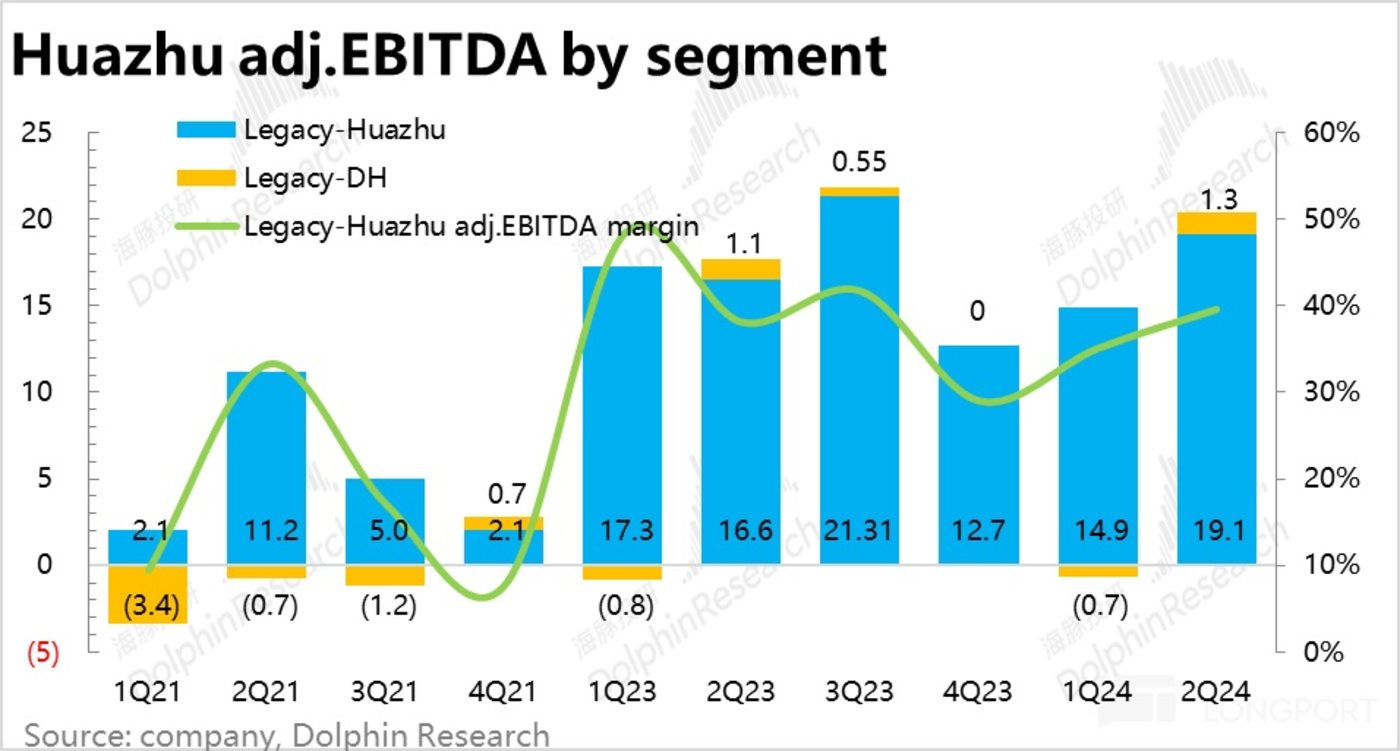 而公司更关注的调整后 EBITDA 指标上,本季整体为 20.2 亿,比预期略多 0.9 亿。分部来看,华住国内的 EBITDA 是同比增长了 15%。海外则是由 1.1 亿增长到了 1.3 亿,虽然增长不错,但体量仍是太小。