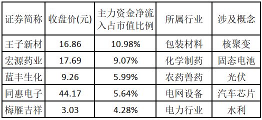 主力资金净流入金额占总市值比例排名前 5 的个股分别为王子新材、宏源药业、蓝丰生化、同惠电子、梅雁吉祥。欢迎大家关注微信公众号 「道达号」,「道达涨停复盘」 栏目为大家复盘市场涨停数据。