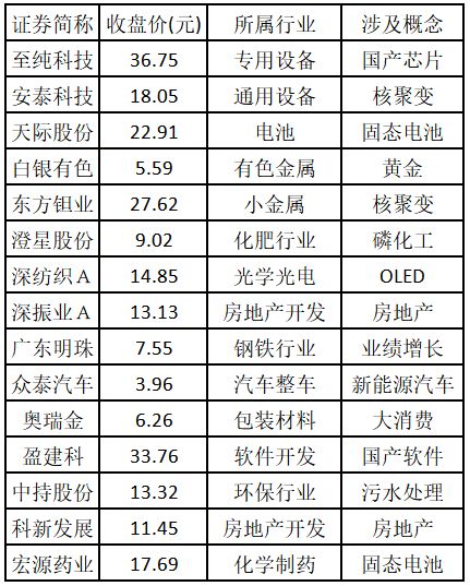 涨停板个股中,股价创出近一年新高的个股有 15 只 (不包括创出历史新高的个股),包括至纯科技、安泰科技、天际股份、白银有色、东方钽业、澄星股份、深纺织 A、深振业 A、广东明珠、众泰汽车、奥瑞金、盈建科、中持股份、科新发展、宏源药业,具体如下表所示。