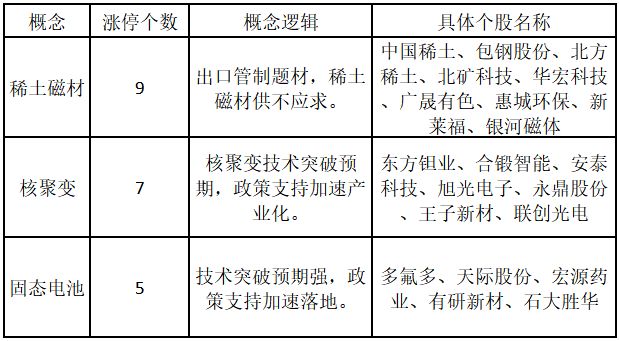 从概念特征来看,今日涨停板个股中,稀土磁材、核聚变、固态电池概念的个股最多。