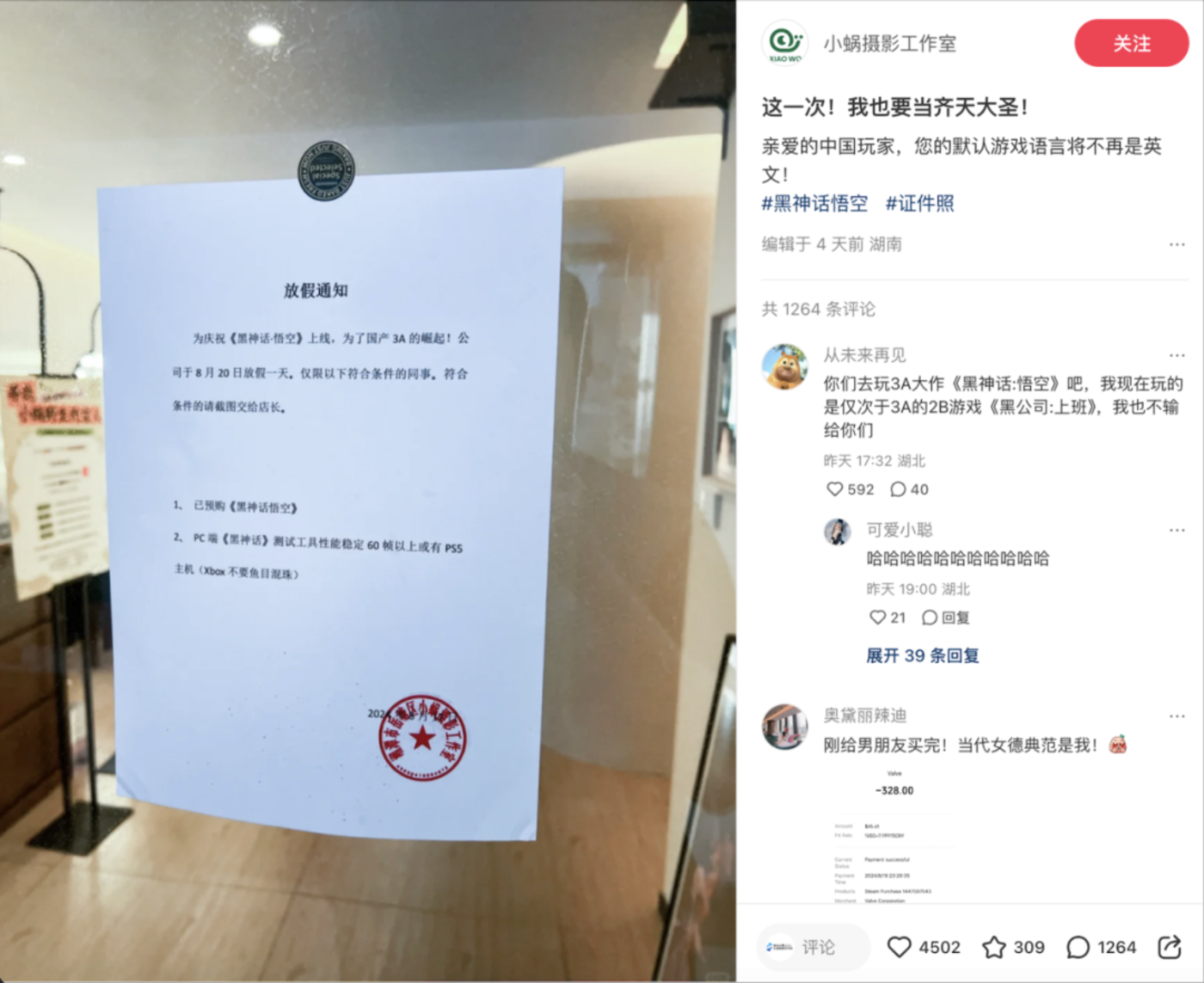据官方数据,新品推出当日即卖出 10 万+杯,导致小程序崩溃。除了销量开花外,热度也随之暴涨,仅宣发日就收获 142 万+的互动热度,买到黑悟空联名咖啡的 「少男」 表示 「终于能理解女生买明星联名奶茶的劲儿了!「、「这联名实在绷不住」。