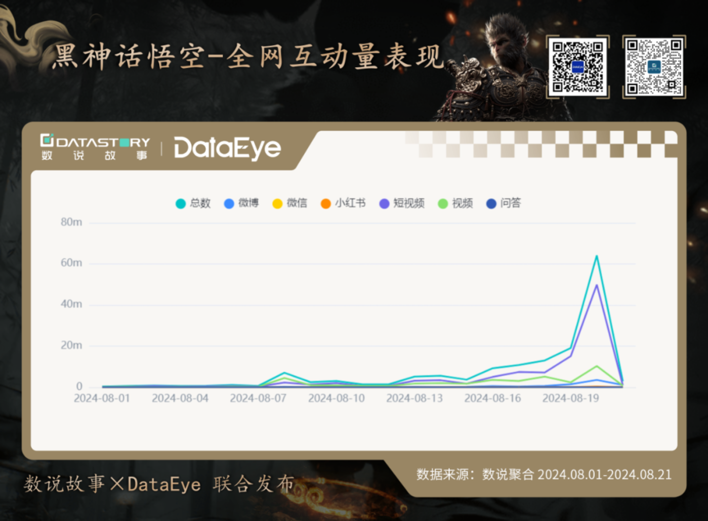 根据数说故事旗下数说聚合数据,自 《黑神话:悟空》 最终预告片 「重走西游」 发布以来,全社媒平台的声量和互动量持续走高,8 月 13 日发布性能测试工具引发小波峰。临近发布日,全网开始各种传梗,「8 月 20 日请假直面天命 「,更有公司直接发出公示准假一天的消息,各路 「玩梗」 和 「好奇心驱使」 让 《黑神话:悟空》 讨论热度不断攀升。