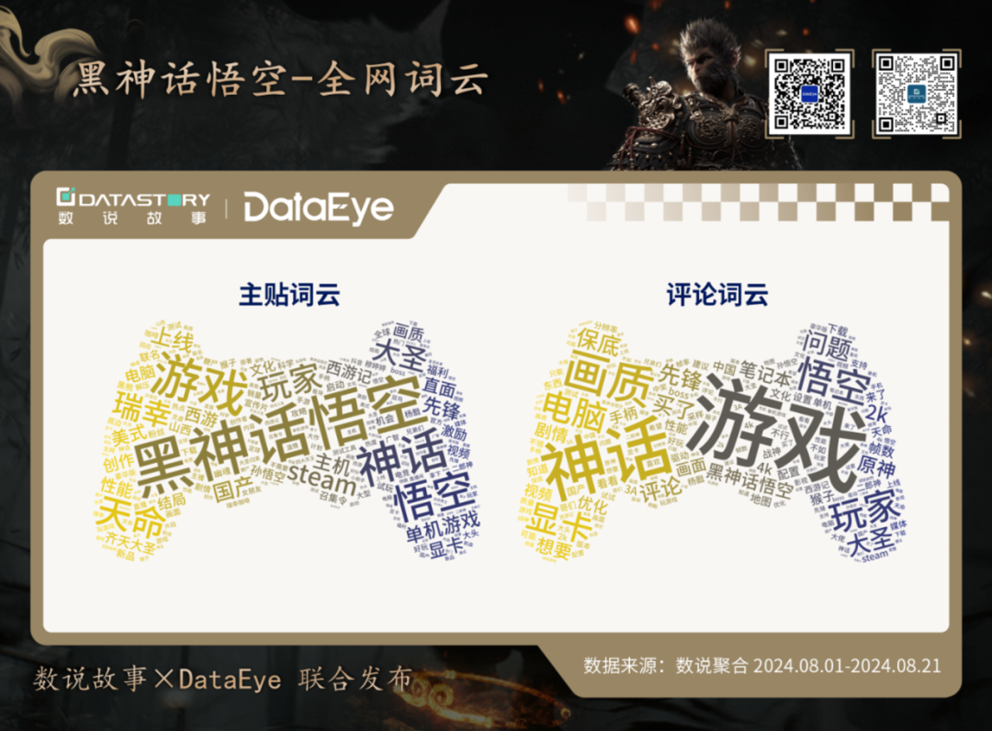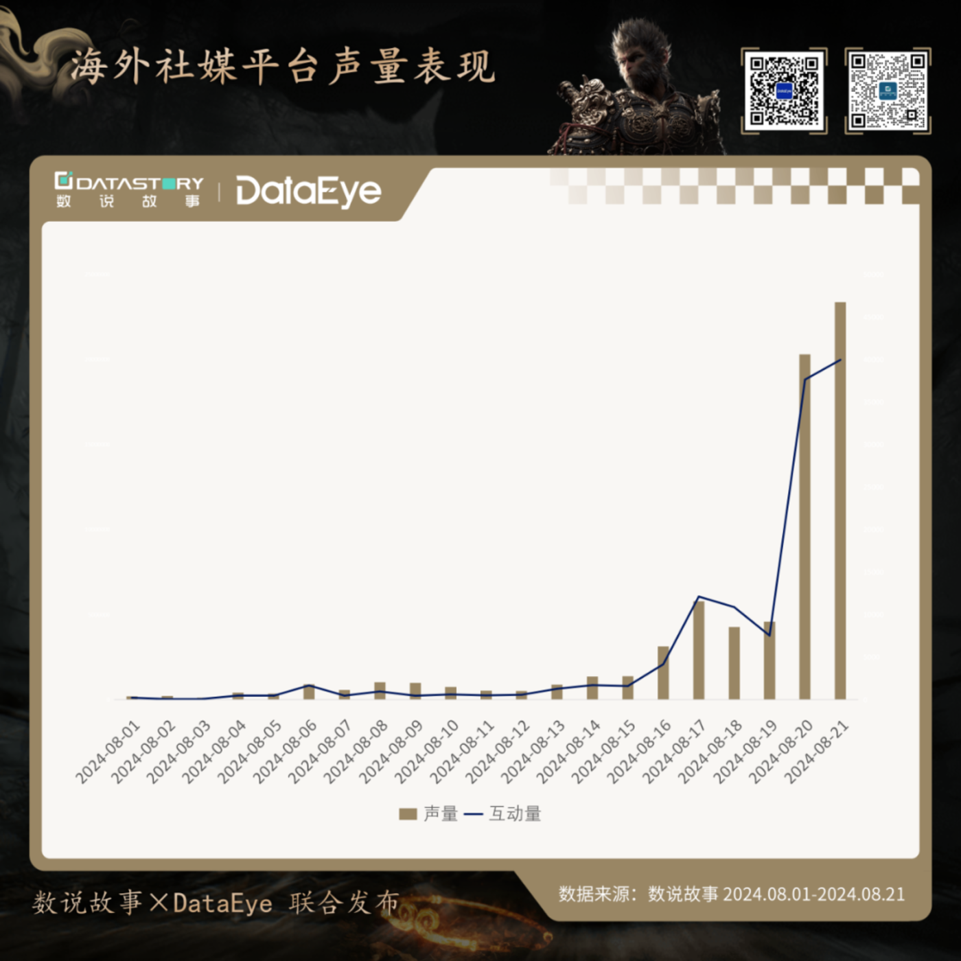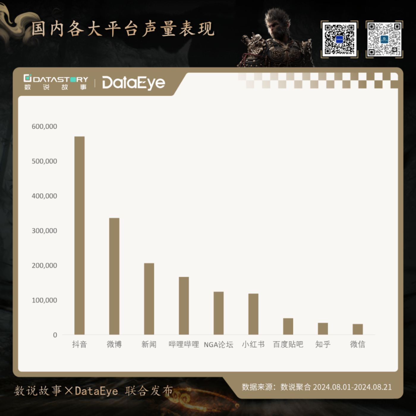 在营销层面上,《黑神话:悟空》 有哪些动作?传播数据如何?为此,数说故事联合 DataEye,从全网声量、互动量、品牌联名、买量传播等角度,全面复盘 《黑神话:悟空》 的热度表现。