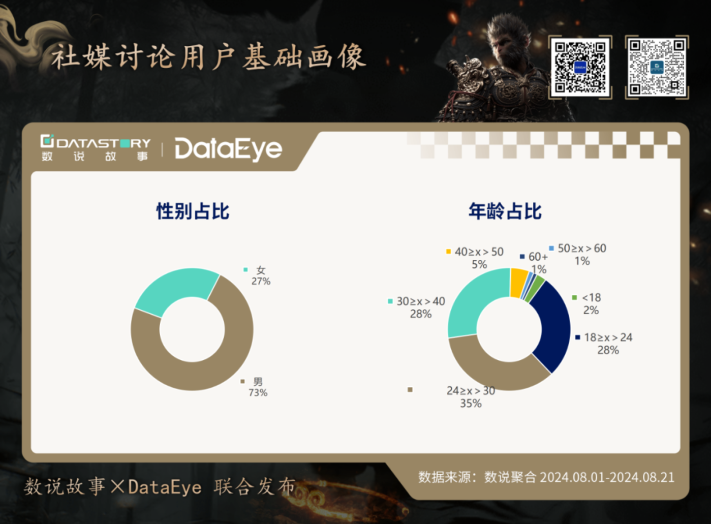 从社媒讨论用户数据来看,关注 《黑神话:悟空》 的用户中,男性占比约为 73%,女性则为 27%。从年龄层来看,24-29 岁用户占比最高,约为 35%,此阶段为 Z 世代人群,是 「互联网土著」,也是 「社会新人」,刚入社会的他们对娱乐性强且解压的游戏兴致高,且消费能力也刚好承担得起;而 18-23 岁和 30-39 岁用户占比均为 28%。
