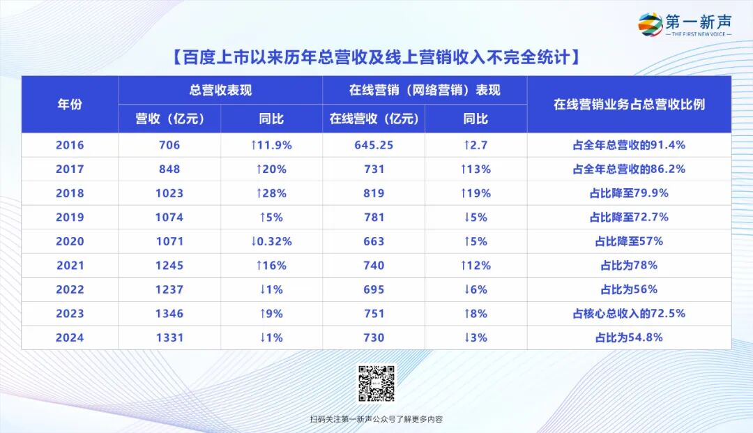 在巅峰时期,百度的在线营销业务营收一度占据总营收的九成以上,堪称不折不扣的“ 现金牛”。如此稳定又庞大的核心业务,让百度在过去的互联网初期得以高枕无忧。