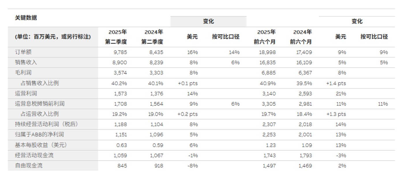 2025 年上半年,ABB 订单额与销售收入继续同比增长 16% 和 8%,分别达到 97.85 亿美元和 89 亿美元。四个事业部中,三个部门贡献增长,唯独机器人与离散自动化事业部因机械自动化业务疲软而持续承压。