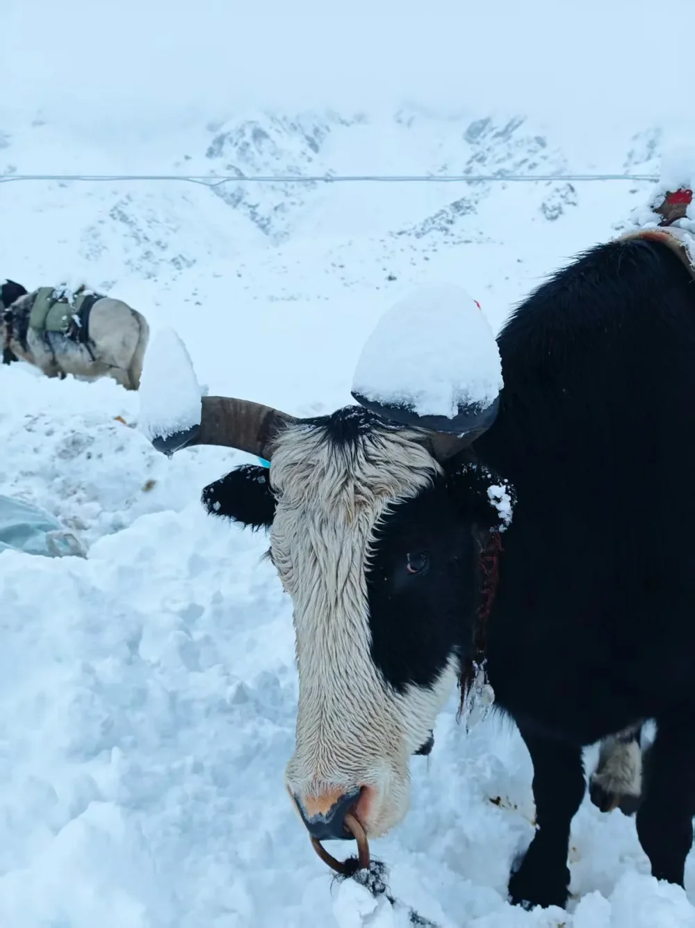 海子告诉时代财经,一头牦牛一般可以负重 80 公斤。但暴雪让路况发生变化,负重的牦牛无法正常在积雪中行走,加之山上野草被大雪掩埋、牦牛面临食物短缺的问题,为此,许多牦牛工都选择先放下徒步者们的行李,及时撤离下山。