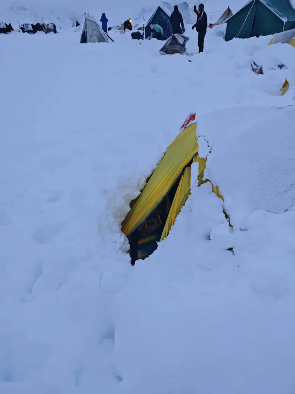 有 14 年经验的徒步者李诺应对从容,从每 40 分钟为帐篷抖一次雪,到后来直接集体撤到更大的客厅帐篷。备用的保暖层也能扛下零下二十度的气温。「我们同行队员都是长期高海拔徒步的人,向导和领队非常专业,所以算是比较有应对经验。」