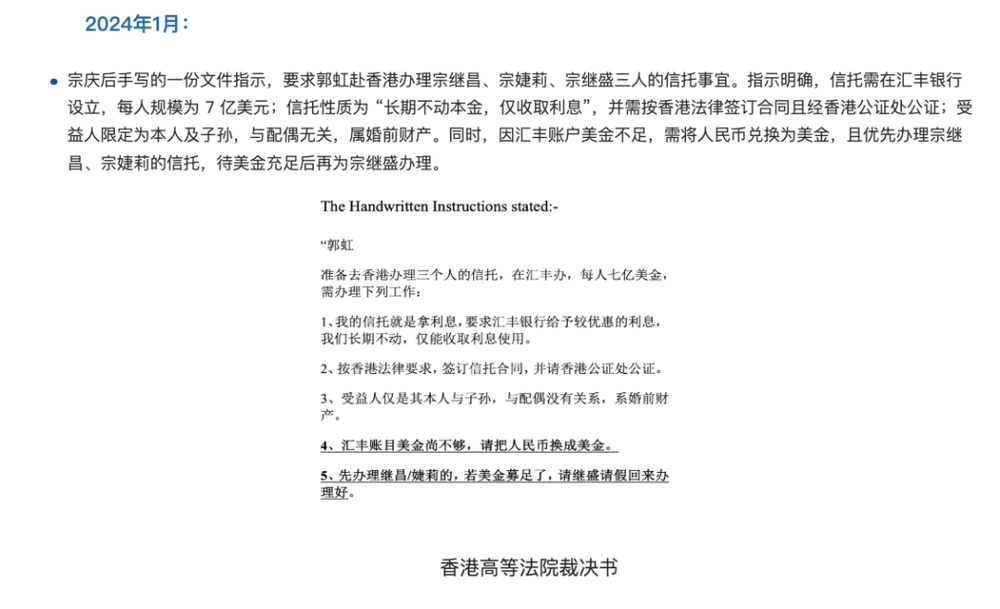 简单来说,宗庆后在去世前,为自己的三名非婚生子女宗继昌、宗婕莉、宗继盛留下了每人 7 亿美元的信托,但由于宗馥莉介入,这份信托权益尚未完全履行,并且宗馥莉还调用了该账户的 108.5 万美元。