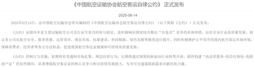 8 月 14 日,中国航空运输协会牵头编制的 《中国航空运输协会航空客运自律公约》 正式发布,倡导各企业严格遵守价格法、反不正当竞争法等,杜绝低于成本价倾销、虚假宣传等恶意竞争行为。