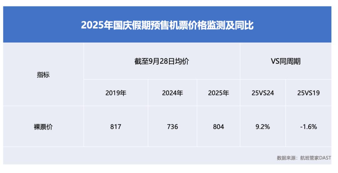 根据航班管家数据,截至 9 月 28 日,2025 年国庆假期预售机票价格,即裸票价为 804 元,同比 2024 年 736 元上涨 9.2%。