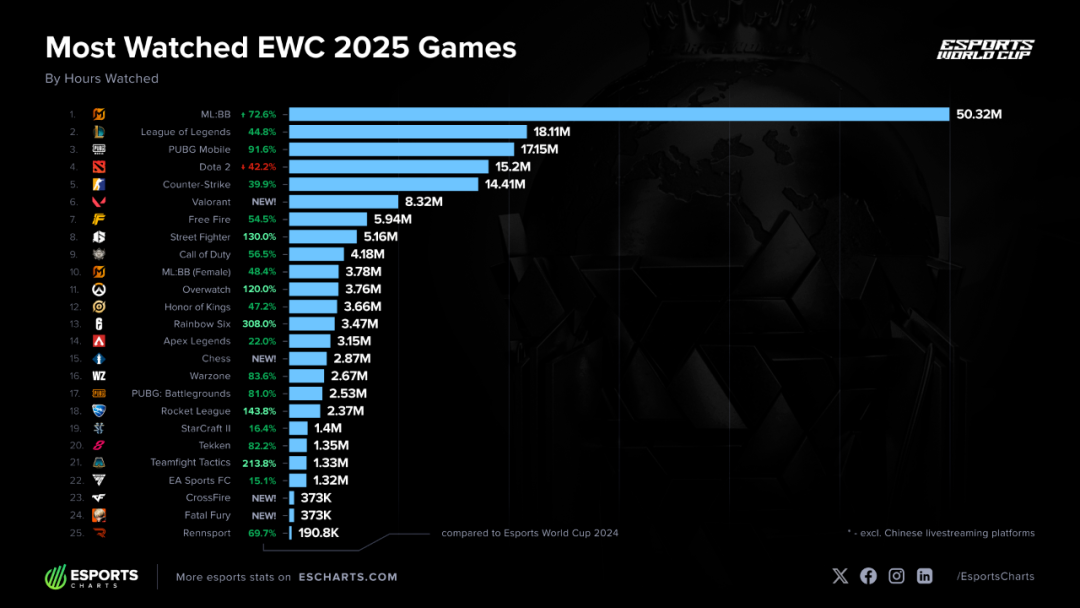 实际上,格斗游戏的社交性在某些方面并不低。比如话题度和电竞热度,时至今日,《拳皇 97》 在互联网上仍然有着不低的热度。今年的 EWC 上,《街头霸王 6》 总观看时长排到所有 25 个项目中排到第 8 位,同比增长 130.0%。