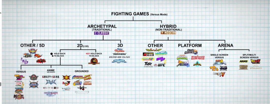 这里参考油管博主 Core-A Gaming 对 FTG 的分类,将 FTG 分为传统格斗游戏和现代格斗游戏。其中传统格斗游戏分为 2D、3D 和其他,2D 即为以 《街霸》 系列、《罪恶装备》 系列为代表的横板格斗,3D 则是 《VR 战士》 系列和 《铁拳》 系列为代表的在 2D 格斗基础上加入侧向移动的格斗。在传统 FTG 中,视角通常锁定为侧面视角。