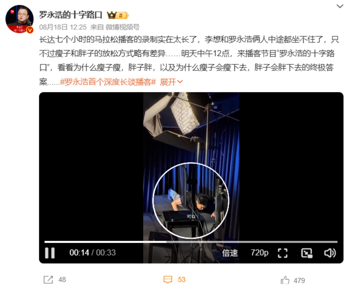 以罗永浩为例,8 月 18 日,罗永浩个人发布微博表示,和理想创始人李想,开启了长达七个小时的 「马拉松」 播客的录制,甚至俩人中途都坐不住了,开始了 「中场休息的运动」。