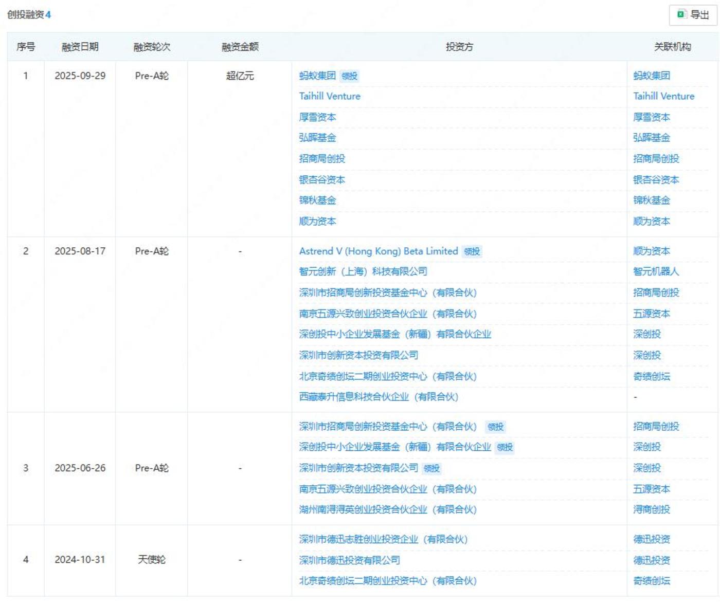 首形科技在 2025 年 6 月至 9 月期间密集完成了三轮融资。其 Pre-A 轮和 A 轮融资先后由招商局创投、深创投和顺为资本领投,而于 9 月底完成的 A+轮融资则迎来了蚂蚁集团的领投。