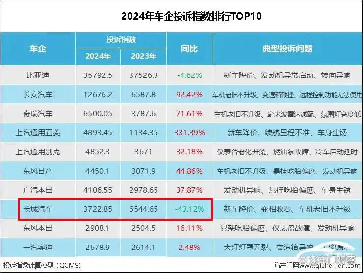 其中,长城汽车以 43.12% 的同比降幅成为投诉榜单中下滑幅度最大的车企,这一数据与魏建军强调的“ 用户满意度导向” 形成呼应。
