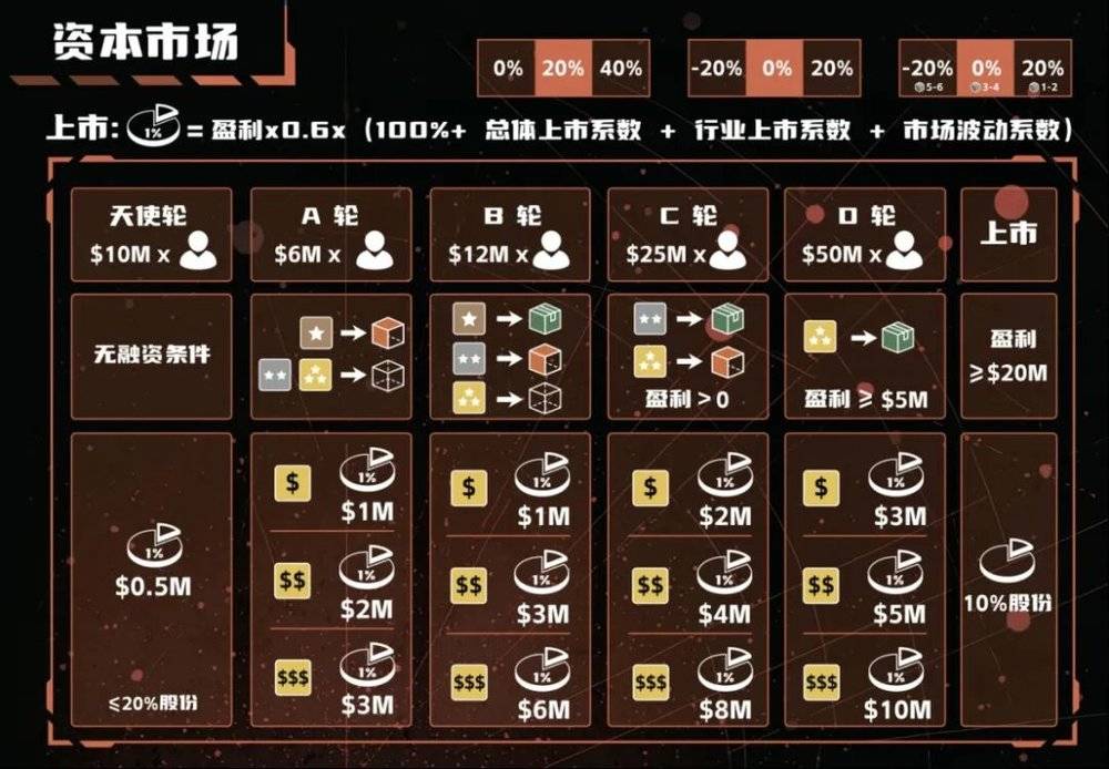 各个轮次的融资条件是研发或者盈利的 milestone,比如 A 轮融资需要 「初级项目样品」 或者 「中级项目 demo」,为获得 A 轮融资条件冲刺的你,像极了那个五一熬到凌晨两点的我。其次游戏中的一回合指代着现实生活中的半年,半年盈利 $20M 就达成上市条件 (暂时还没有设计什么科创板推荐制度、港股 18C 之类更真实的机制;以后有机会的话出个扩展包吧)。