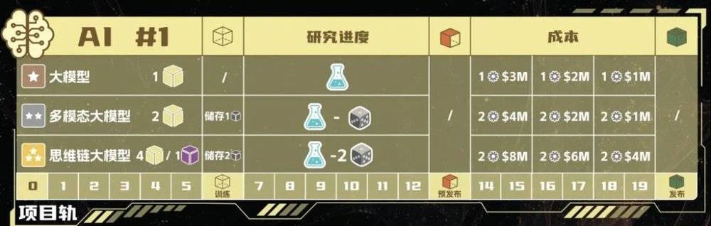 于是我又引入了骰子,初级项目可以不受骰子影响,但高级项目掷出来 6 需要直接减 12 点科研点数,技能树点错了干多少就白费。同时做了许多卡牌来描述相关的事件,比如 「VR 辅助机器人训练」 就是来自于我们身边的真实项目。当然还要在机制里加入老板们的终极梦想:可以直接使用 AI 顶替科研点数,使用机器人顶替生产点数,哪里不会点哪里,投资人再也不用担心我的降本增效了。