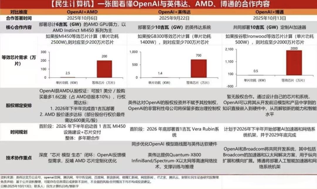 在 2025 年短短几个月内,OpenAI 先后主导了与英伟达 (NVIDIA)、AMD、Oracle、博通等巨头的一系列数额巨大的订单,并计划启动一系列大规模 AI 基础建设项目。10 月 13 日,OpenAI 又与博通达成了部署 AI 芯片的订单。