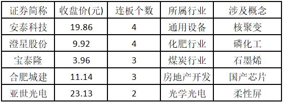 从连板情况来看,今日首板个股有 26 只;2 连板的个股有 7 只;3 连板及以上的个股有 4 只。今日连板数排名前 5 的个股包括安泰科技、澄星股份、宝泰隆、合肥城建、亚世光电,具体如下表所示。