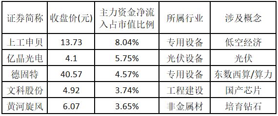 主力资金净流入金额占市值比例排名前 5 的个股分别为上工申贝、亿晶光电、德固特、文科股份、黄河旋风。欢迎大家关注微信公众号 「道达号」,其 「道达涨停复盘」 栏目为大家解读。