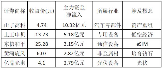 从主力资金来看,今日涨停板个股中,主力资金净流入金额排名前 5 的个股分别为山子高科、上工申贝、东信和平、黄河旋风、亿晶光电。