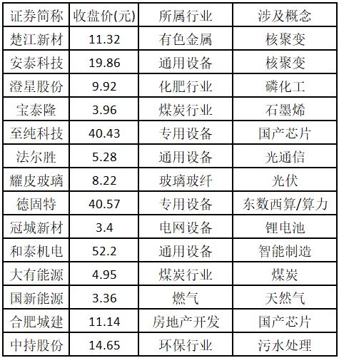 涨停板个股中,股价创出近一年新高的个股有 14 只 (不包括创出历史新高的个股),包括楚江新材、安泰科技、澄星股份、宝泰隆、至纯科技、法尔胜、耀皮玻璃、德固特、冠城新材、和泰机电、大有能源、国新能源、合肥城建、中持股份,具体如下表所示。