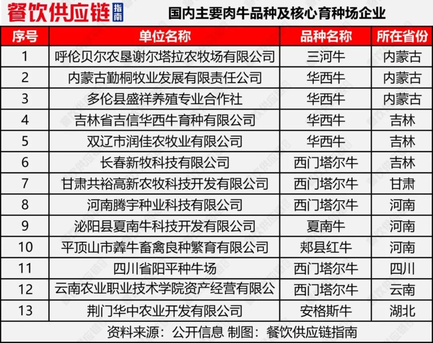 根据农业农村部今年 3 月公布的 2024 国家畜禽核心育种场增补名单,现有国家肉牛核心育种场地共 13 家,含今年新增的 5 家。也有部分企业自研繁育,如内蒙古中农兴安种牛科技有限公司纯种牛繁育分公司。