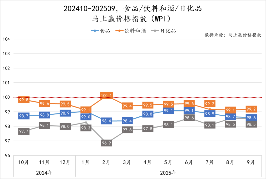 从趋势上看,进入 Q3 以来,三者走势呈现较大的差异—— 饮料在 5–6 月达到阶段高点 (99.5–99.6) 后,随着夏季旺季的竞争加剧在 7–9 月略有回落,或可提示今年的竞争依然以“ 以价换量” 与“ 性价比” 策略为核心;食品价格亦从 99.1 下滑至 98.6,趋势上依然呈现一定程度的下行;相比来说,日化品则呈现出一定的回升。