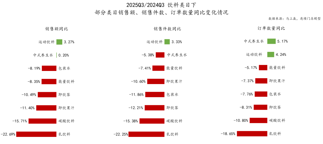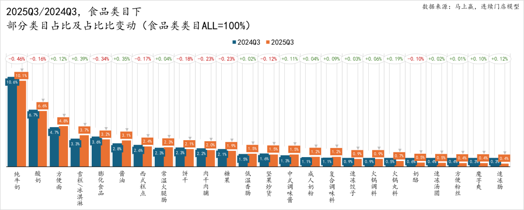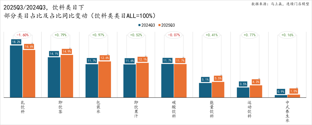 2025Q3 的饮料类目中,乳饮料呈现明显的占比同比下滑,碳酸饮料小幅下滑,其余类目则均呈现占比同比上涨。