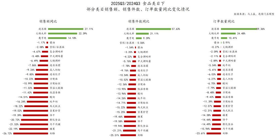 从整体来看,2025Q3 食品类目中,速冻肠、火锅丸料、魔芋爽成为少数在销售额、销售件数、订单数量三个指标上均实现同比增长的类目,表现亮眼。虽然三个类目整体的规模都不算大,在诸多的传统食品类目中也都可以算是“ 新兴产品”,但其较好的涨势或许也体现出了消费需求的变化趋势----围绕着方便、健康、多样化进行产品形态的延展与创新。