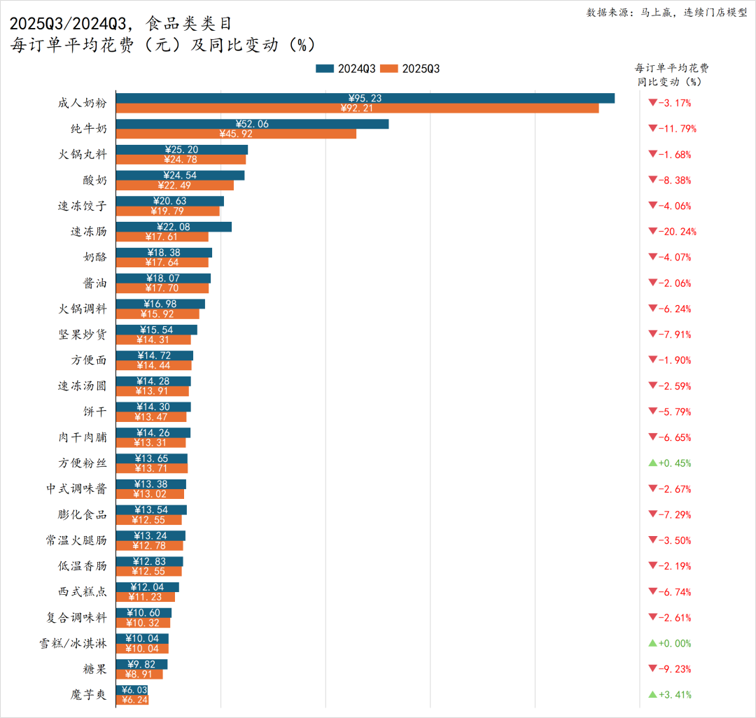 从整体来看,2025 年 Q3 食品类目中,不同子类目的每订单平均花费差异显著,其中成人奶粉、纯牛奶、酸奶、奶酪等乳制品整体依然位居前列,显示其相对高客单价的特性。但与此同时,这些高价类目的同比降幅也较为明显,尤其是纯牛奶类目,其每订单平均花费同比下降接近 12%,或许也是上文中提到的占比、类目销售额同比下降的重要构成因素之一。