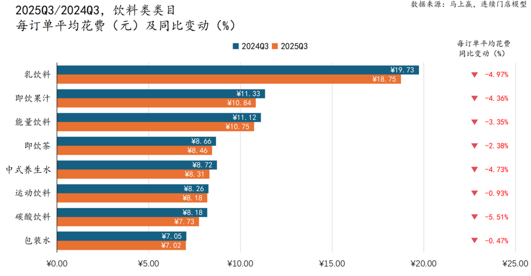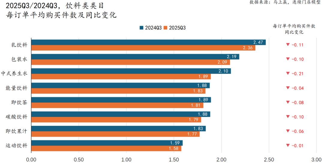 从整体来看,2025Q3 饮料类目各细分品类的每订单平均购买件数均较去年同期下降,其中中式养生水下降最为明显,达到-0.21pcs/每订单平均。