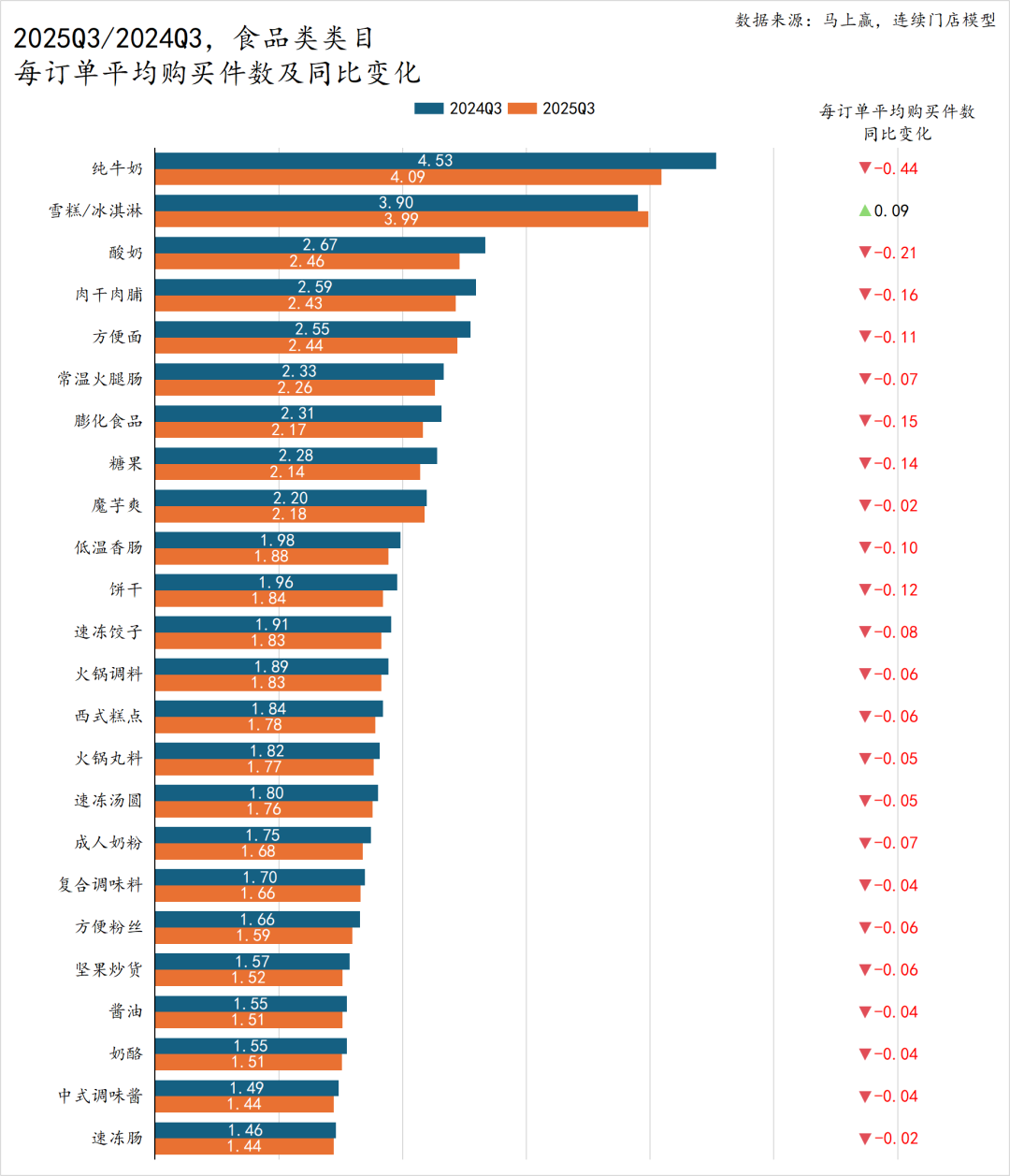 从整体来看,2025 年 Q3 食品类目中,除了雪糕/冰淇淋,其他所有子类目的每订单平均购买件数均同比下降,显示消费者整体进入更为理性的购买阶段,囤货性购买与单次购买量或正在进一步减少。