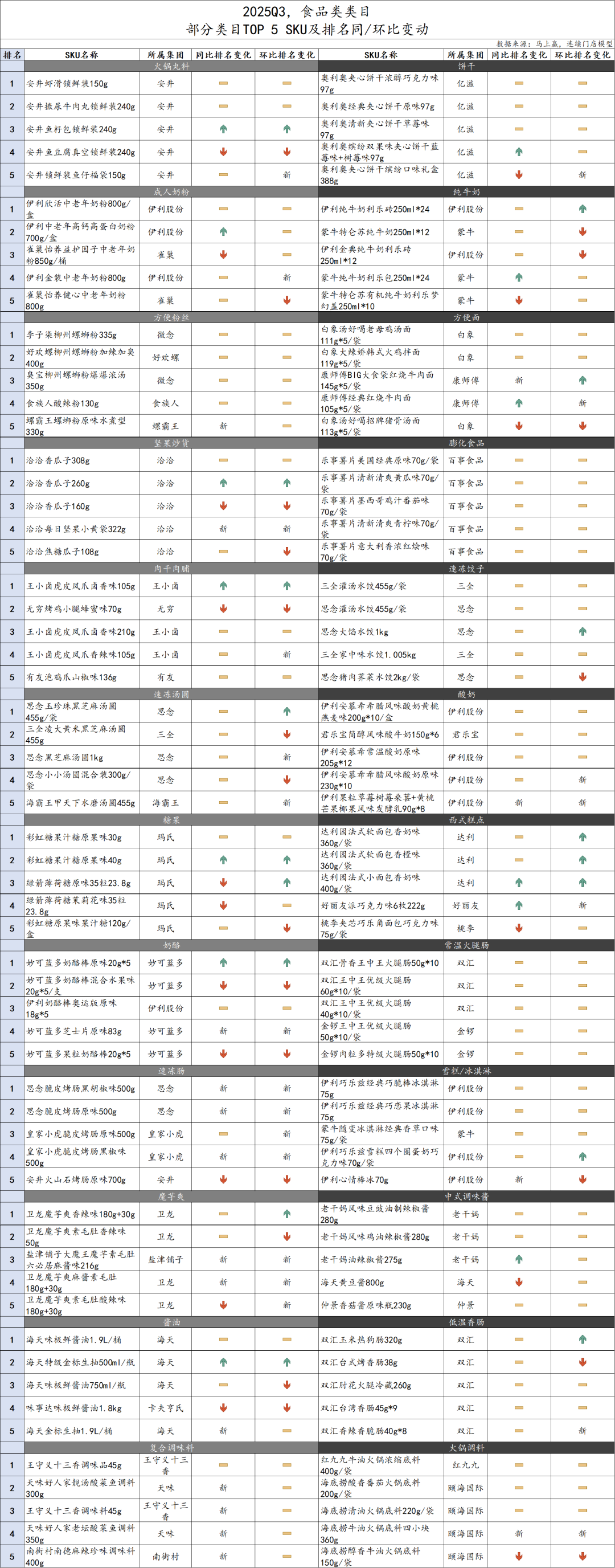 下表中 TOP SKU 为 2025Q3 的类目 TOP SKU,其排名变化同比季度为 2024Q3,环比季度为 2025Q2。排名同/环比变动的表达上,“-” 代表该 SKU 与同/环比下上一时间周期排名一致,“ 新” 代表该 SKU 在同/环比上一周期本季度首次上榜 (并不意味是新品),“↑” 代表该 SKU 同/环比下本季度排名提升,“↓” 代表该 SKU 同/环比下本季度排名下降。