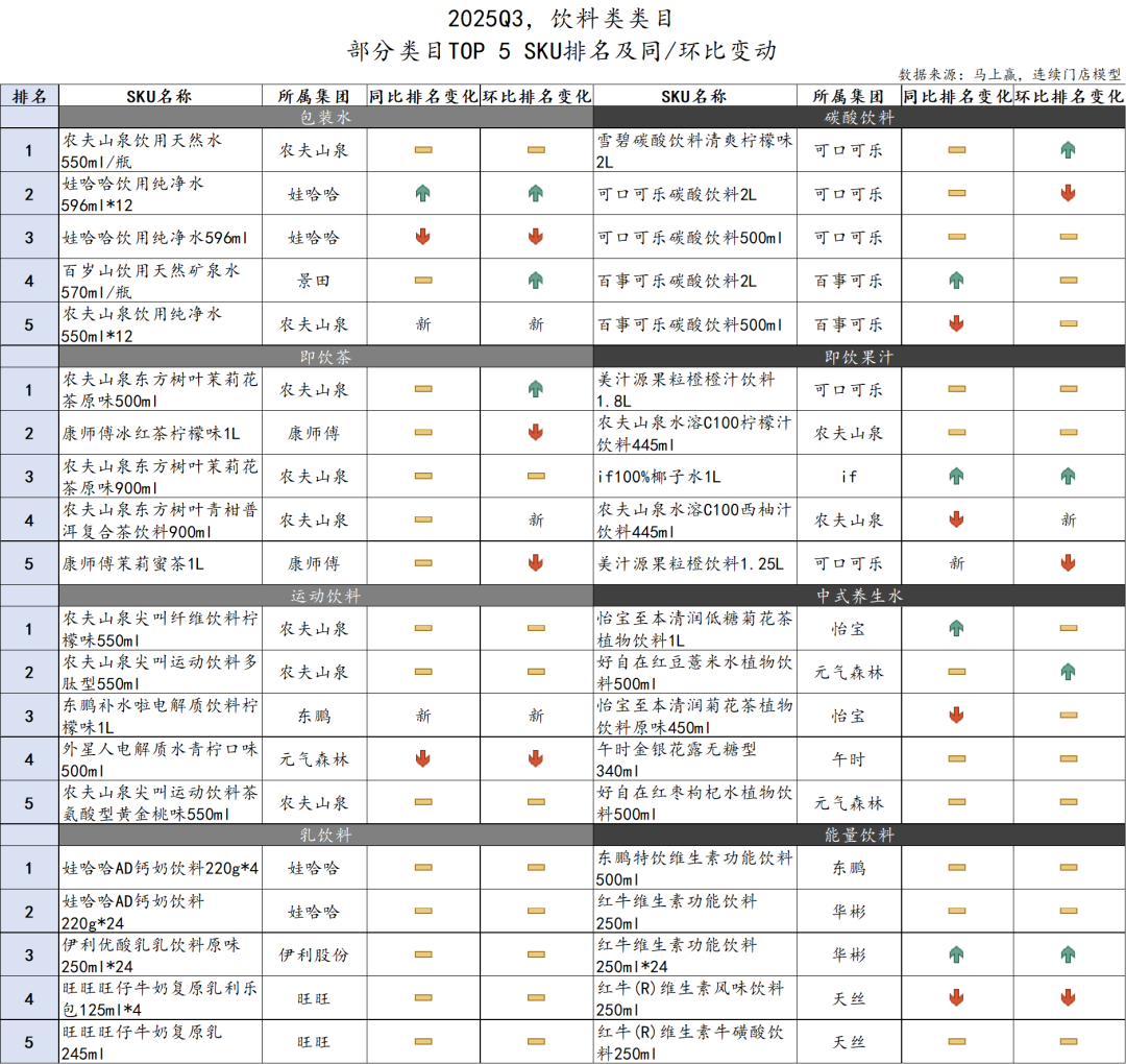 2025 年 Q3 饮料类整体变动相对温和,榜单中产品的更替频率明显低于食品类,显示饮料市场的头部格局更稳定、竞争节奏更平缓。主力品牌如农夫山泉、可口可乐、怡宝、娃哈哈等依然牢牢占据品类核心席位,头部 SKU 延续高认知、高铺市的优势,市场仍以品牌力和渠道覆盖取胜。总体来看,饮料类在本季度的结构相对稳健,主流品类延续强势,新兴品牌和功能性产品则成为推动细分增长的新力量。