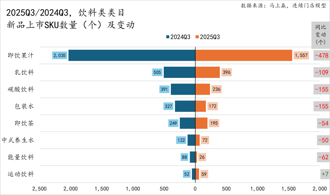 从品类分布看,即饮果汁依旧是上新数量最多的板块,本季新增 1,557 个 SKU,虽同比减少 478 个,但仍远超其他饮料类别,稳居创新主阵地。另一方面,前两年迅速崛起的中式养生水则出现明显降温,上新数量从 122 个降至 72 个,跌幅接近四成。考虑到该类目此前的高关注度与高速增长,这一变化可能意味着市场已进入阶段性瓶颈:一方面玩家蜂拥而入、同质化突出;另一方面消费者对“ 健康”“ 天然” 卖点的期待提升,但产品创新与体验尚未跟上。