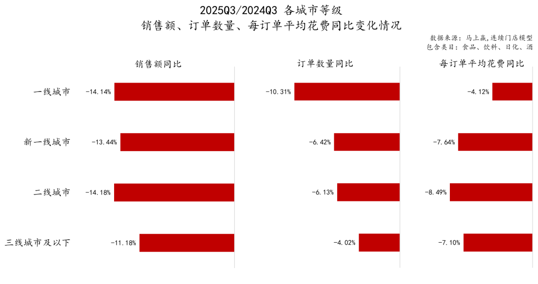 从不同城市等级维度看,2025Q3 各城市等级的销售额均呈现同比下滑,一线与二线城市的同比下滑幅度较大 (均超过 14%),新一线城市紧随其后,三线城市及以下的同比跌幅相对较小。从结构上看,高线城市订单数量下降更为明显,其中一线城市订单量同比下降 10.31%,远高于每订单平均花费同比降幅 4.12%;而在下线城市,订单平均花费的下降幅度更大 (–7% 至–8% 区间),成为拉低销售额同比的主要因素。