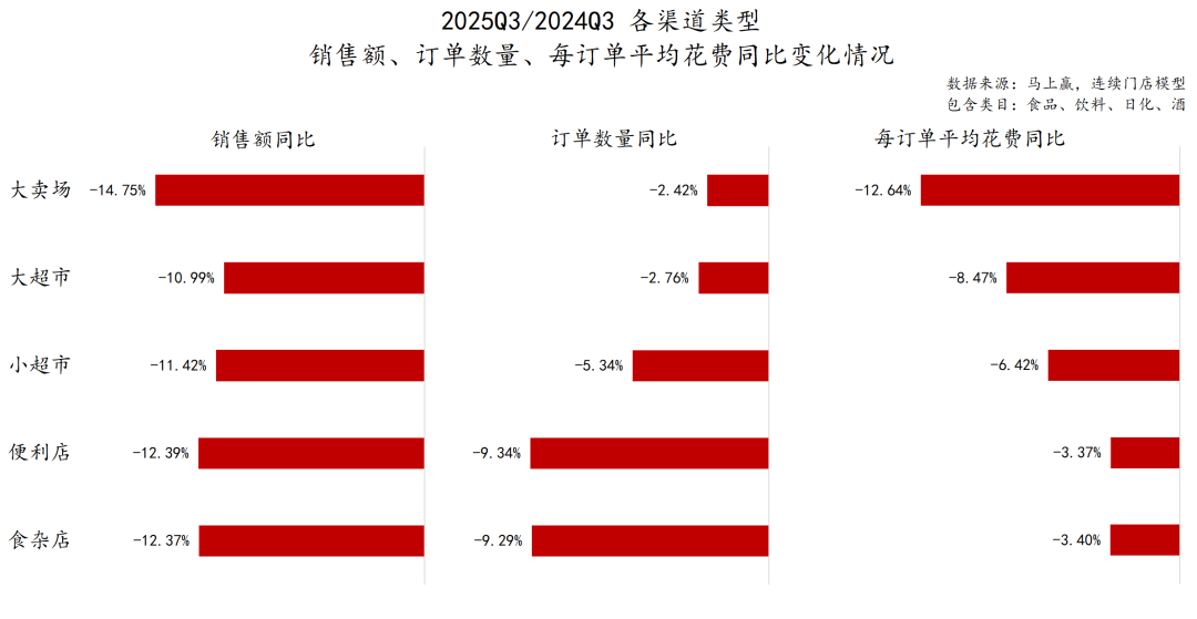 从整体表现来看,2025Q3 各业态销售额同比均较去年同期下滑,其中大卖场降幅最大 (–14.75%),大超市、小超市、便利店及食杂店也录得约 10% 左右的回落。对比结构可见,大业态 (大卖场、大超市) 的下滑主要来自客单价下降,消费者单次支出收紧;而小业态 (小超市、便利店、食杂店) 的下滑则更多源于订单减少,近场消费的热度或仍在下行通道当中。