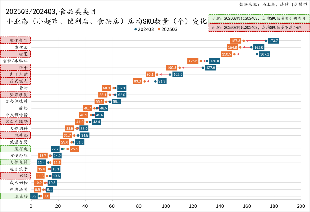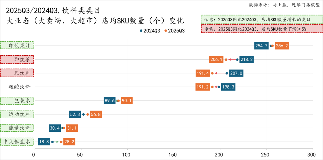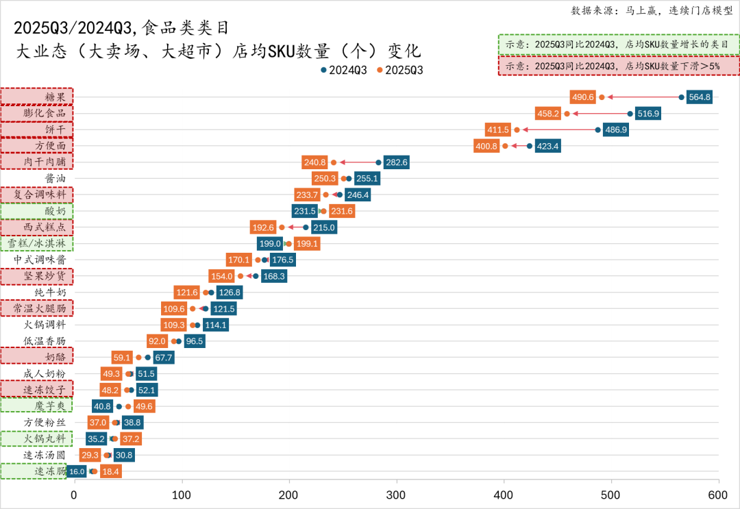 在下面的组图中,类目文字上有绿色虚线方框意为该类目在该业态类型中的店均 SKU 数量同比有所增长,没有背景色块的、红色虚线方框的类目则是店均 SKU 数量同比有所减少,其中红色虚线方框为 2025Q3 同比 2024Q3,店均 SKU 数量同比下降超过 5% 的类目,敬请知悉。