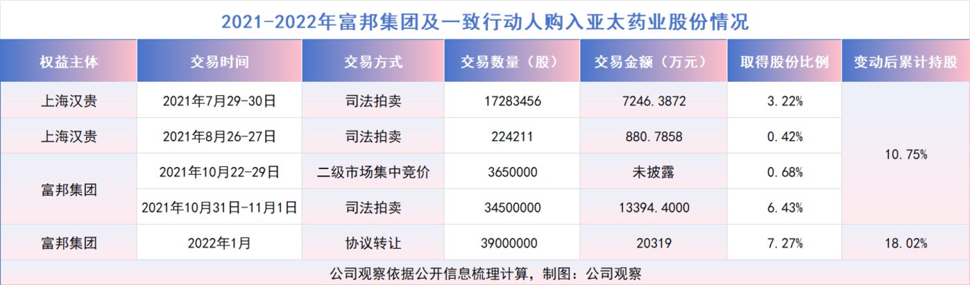 转让完成后,富邦集团及一致行动人将不再持有公司股份,彻底退出亚太药业。
