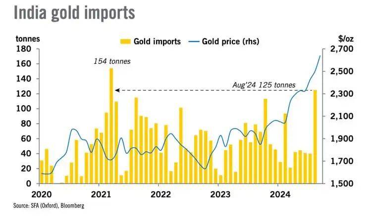 但印度的金铺们似乎并不遵循市场规律,9 月份,印度的黄金的进口量,环比增长近 100%,一个月时间买了大约 120 吨!