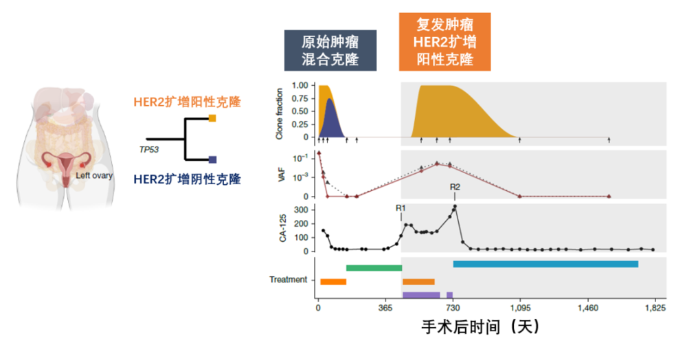 分析发现,她的原发肿瘤其实有两个亚克隆,几乎是 1 比 1 的比例混合。其中一个亚克隆有 HER2 基因扩增,另一个没有。和上一位患者类似,她的化疗后效果也不错,肿瘤标志物 CA-125 下降,影像显示肿瘤负荷减少,ctDNA 也在第 156 天显示清零,一切看起来都很好。