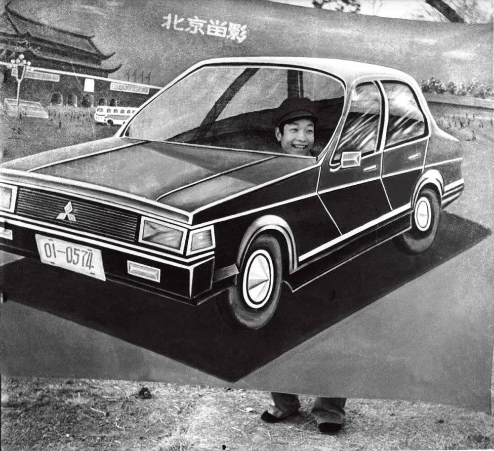 1983 年 4 月,河南平顶山。河滨公园内,在轿车布景板里留影的青年。有心的商业摄影师布置了这个场景,满足人们对现代生活的渴求,生意非常好。(图/冯立军)