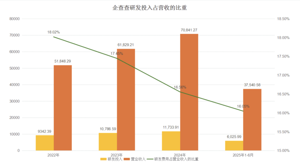 2022 年到 2024 年,公司研发费用呈上涨趋势。不过企查查的研发投入却并没有赶上营收的增长速度,2022 年到 2025 年 1 到 6 月,研发投入占营业收入的比例从 18.02% 一路下滑至 16.05%,金额分别为 9342.39 万元、1.08 亿元、1.17 亿元和 6025.99 万元。
