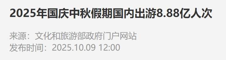而在国庆档期间,此类演出市场的表现不仅仍然强势,还有更多如旅游的娱乐活动占据了观众的精力和时间。据文化和旅游部数据显示,2025 年国庆中秋 8 天假期间,国内出游 8.88 亿人次,较 2024 年国庆节假日 7 天增加 1.23 亿人次;国内出游总花费 8090.06 亿元,较 2024 年国庆节假日 7 天增加 1081.89 亿元。