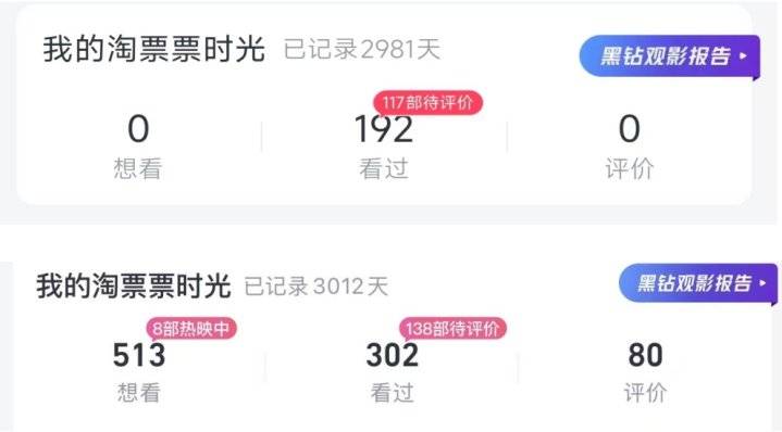 据淘票票数据显示,影迷西西八年来累计在院线看过 302 部电影,平均每年 38 部,由于在北京上学、工作,每年的北影节也不会缺席,朝阳海淀连轴转是常有的事,称得上是铁杆影迷。