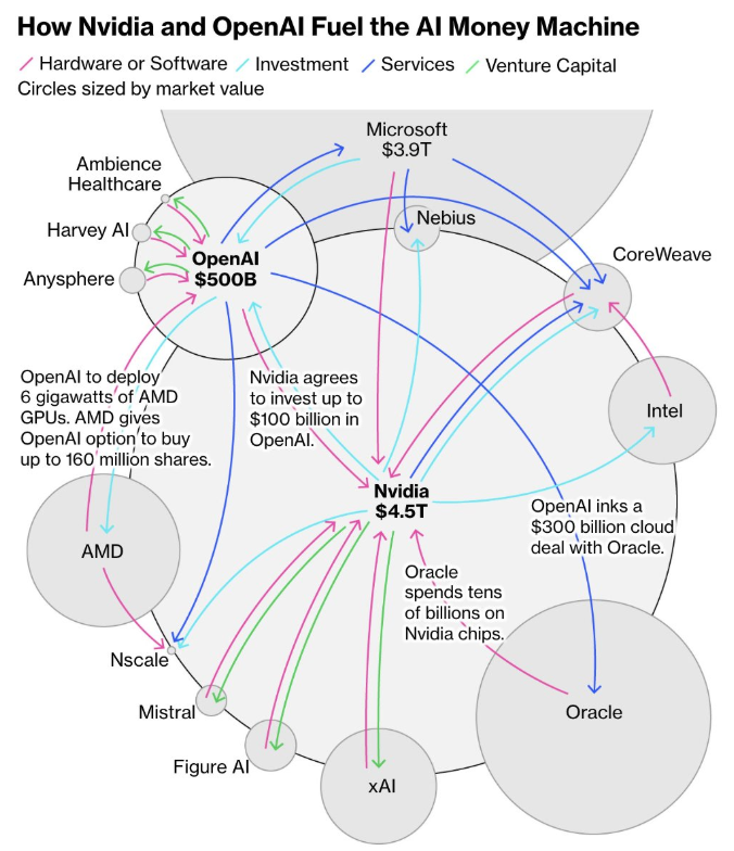 一时间,OpenAI、甲骨文和英伟达形成了 「AI 铁三角」,三方市值或估值均获大涨。