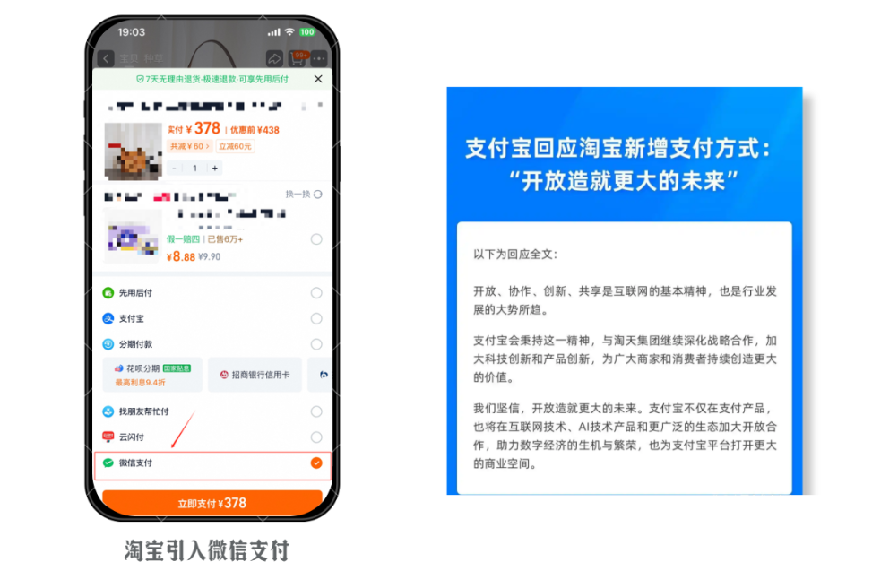2024 年 9 月,淘宝宣布新增微信支付能力,全面引入微信支付