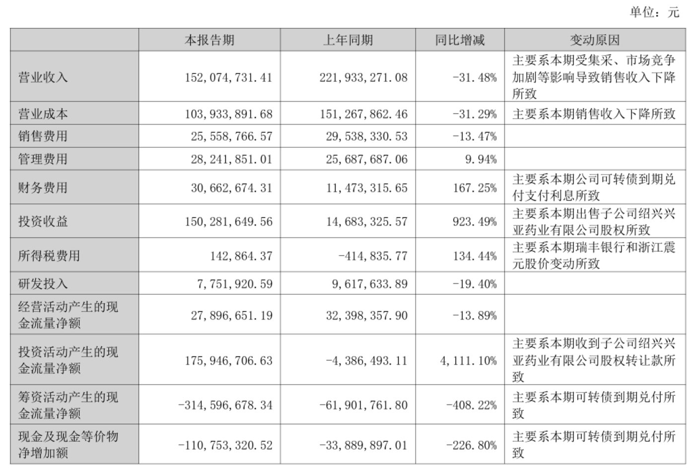 其中,归母净利润暴涨主要系公司出售全资子公司绍兴兴亚药业有限公司 100% 股权,相应增加公司 2025 年半年度利润总额约 1.49 亿元所致;剔除上述非经常性损益项目的影响,亚太药业的亏损底色未变。
